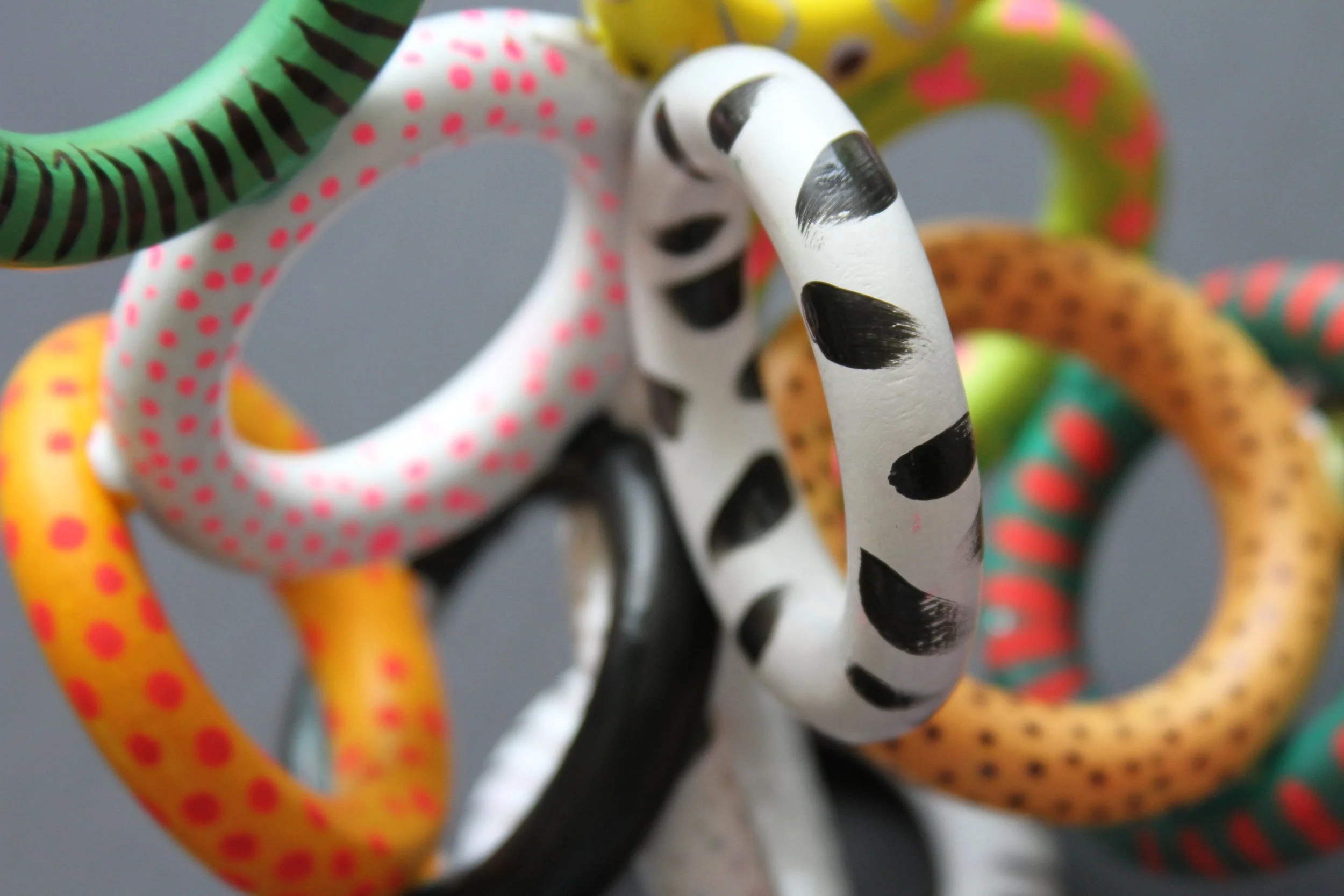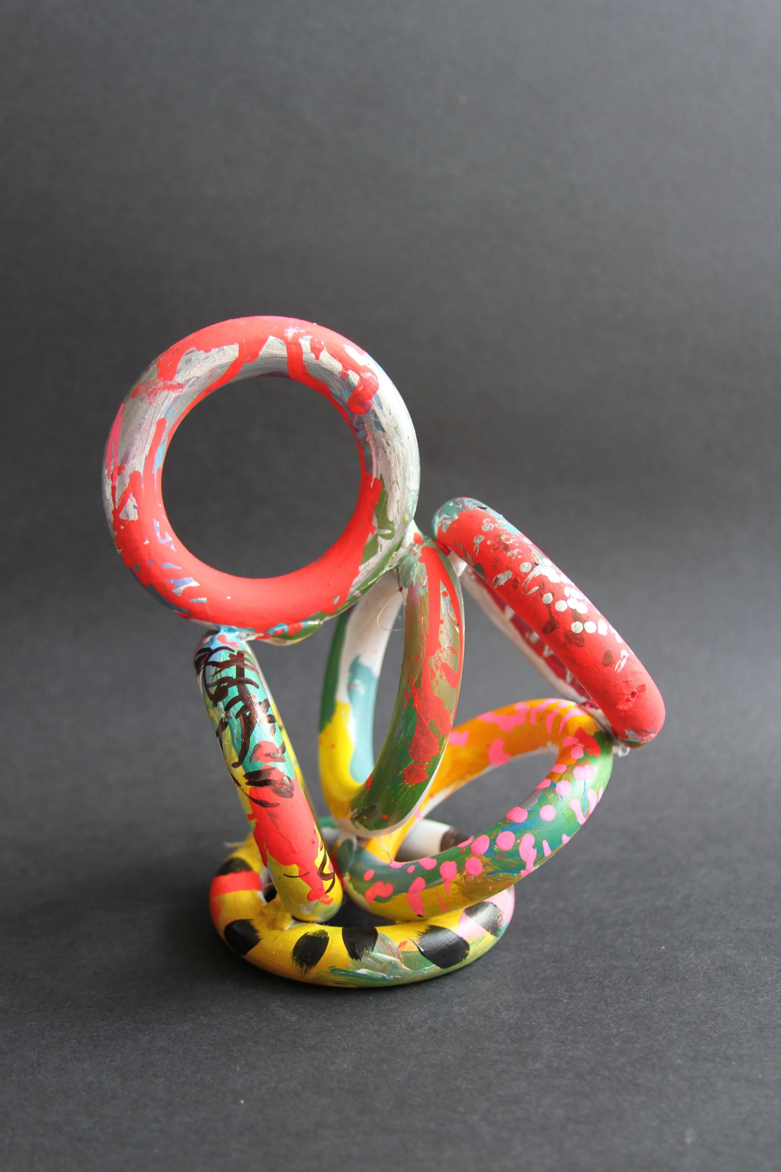 They are equally as fun/tricky to arrange and glue as they are to paint. It takes a little experimenting to get a form that balances, and to paint them you need to turn them over and over to get the colour in the right places. Older kids can experiment with complicated contrasting patterns and younger kids can just go colour crazy.