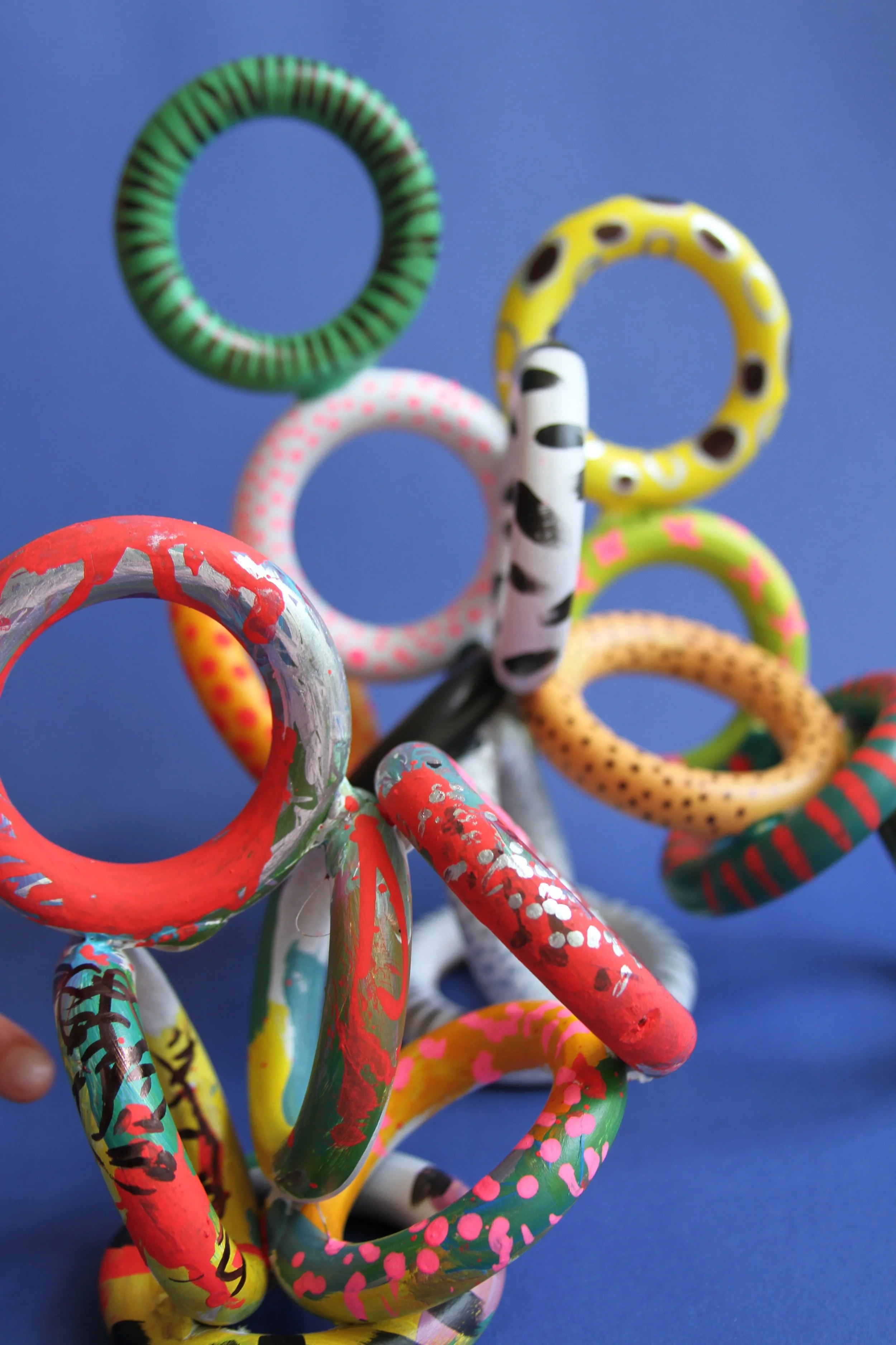 This is where you can really go crazy. Using a variety or paint pens and markers or coloured acrylic or tempera paint, apply a variety of patterns on to your rings. Try spots, stripes, crosses, paint strokes, zig zags, or a combination of everything! The wilder the combinations the better. Again, younger kids can just freestyle here.