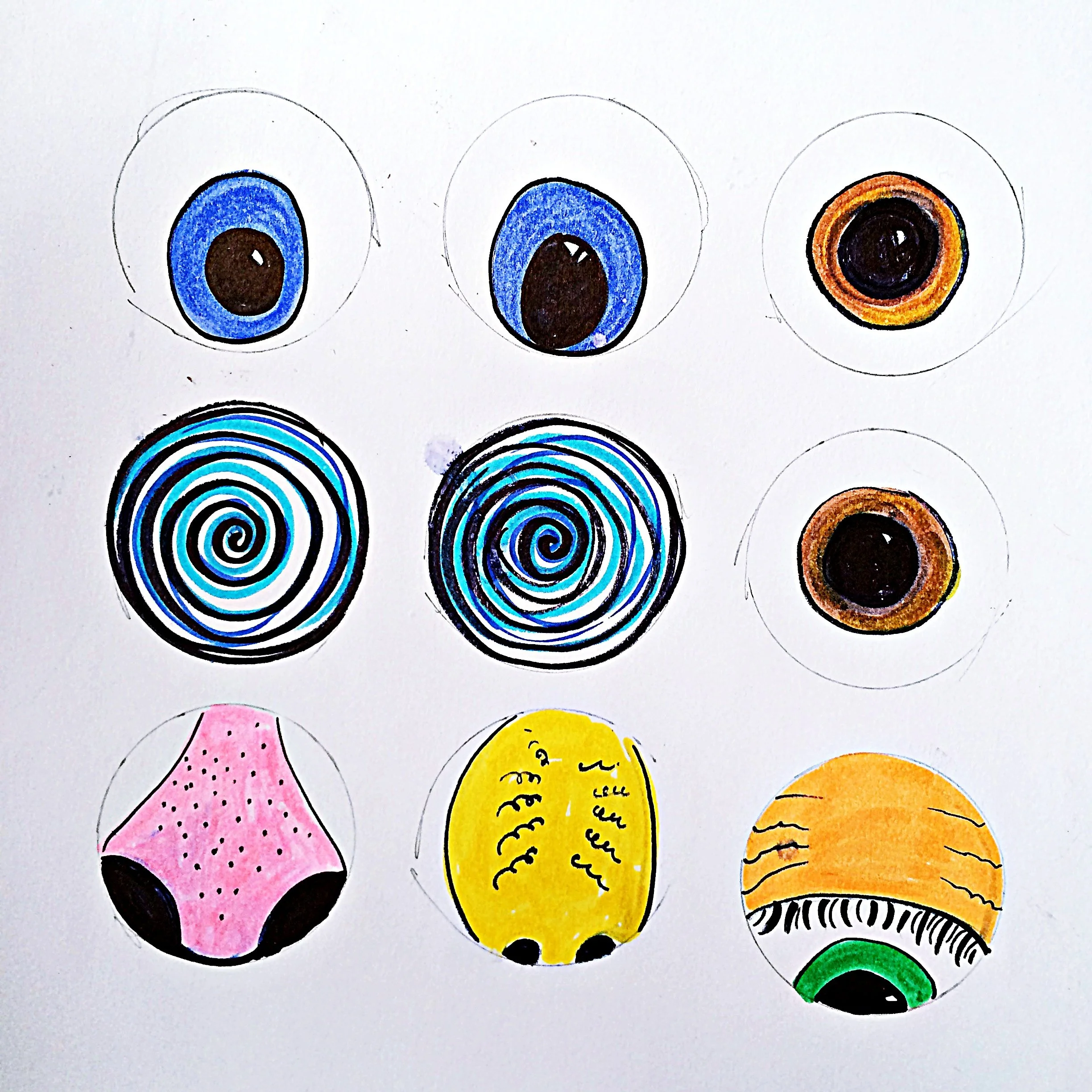 3. Not all your facial features will fit within the shape of a circle so on another piece of paper draw some more crazy eyes, noses and mouths. You may even want to try out a mustache or two!