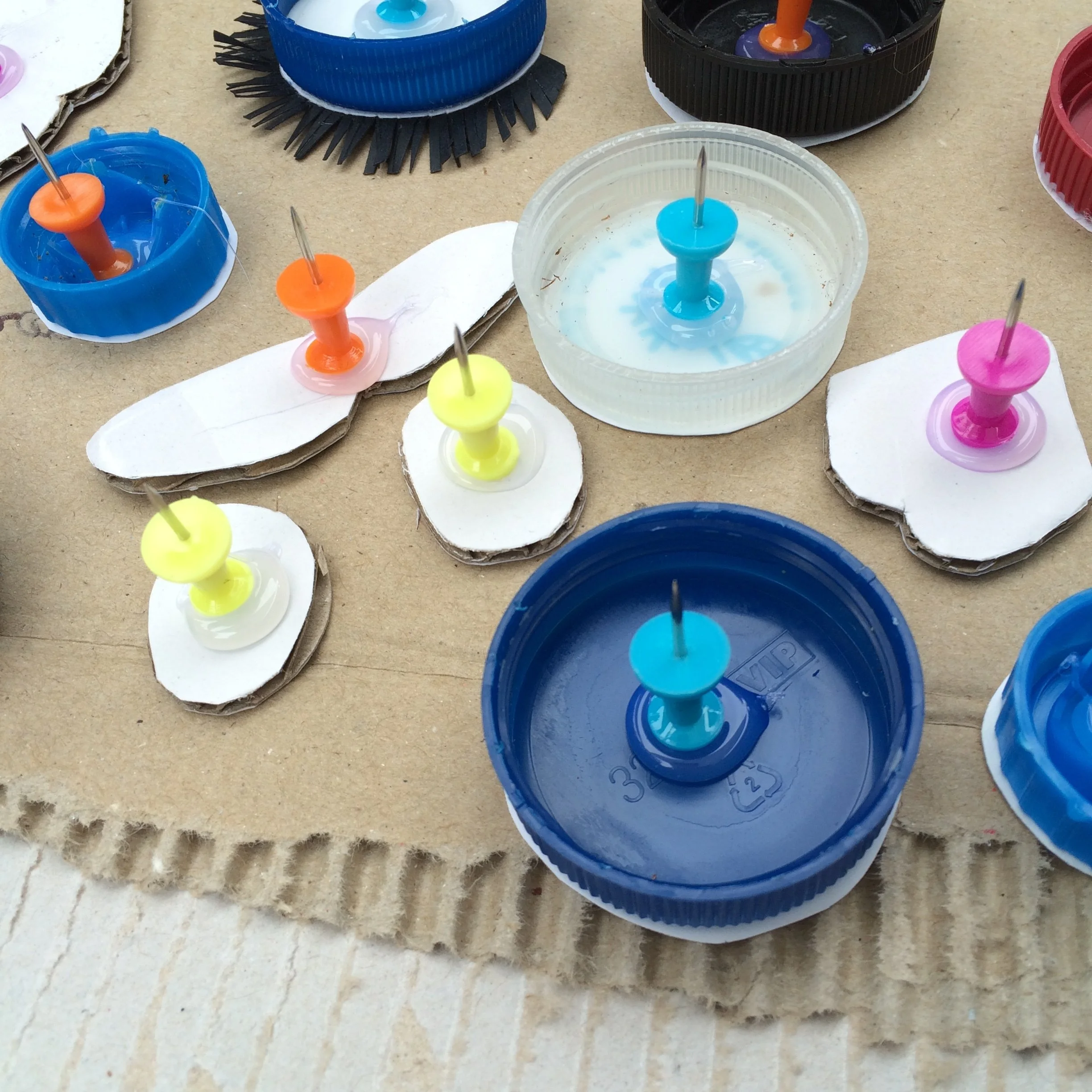 5. Attach push pins to the back of both the cardboard cut outs and the bottle lids. Hot glue is best for this.