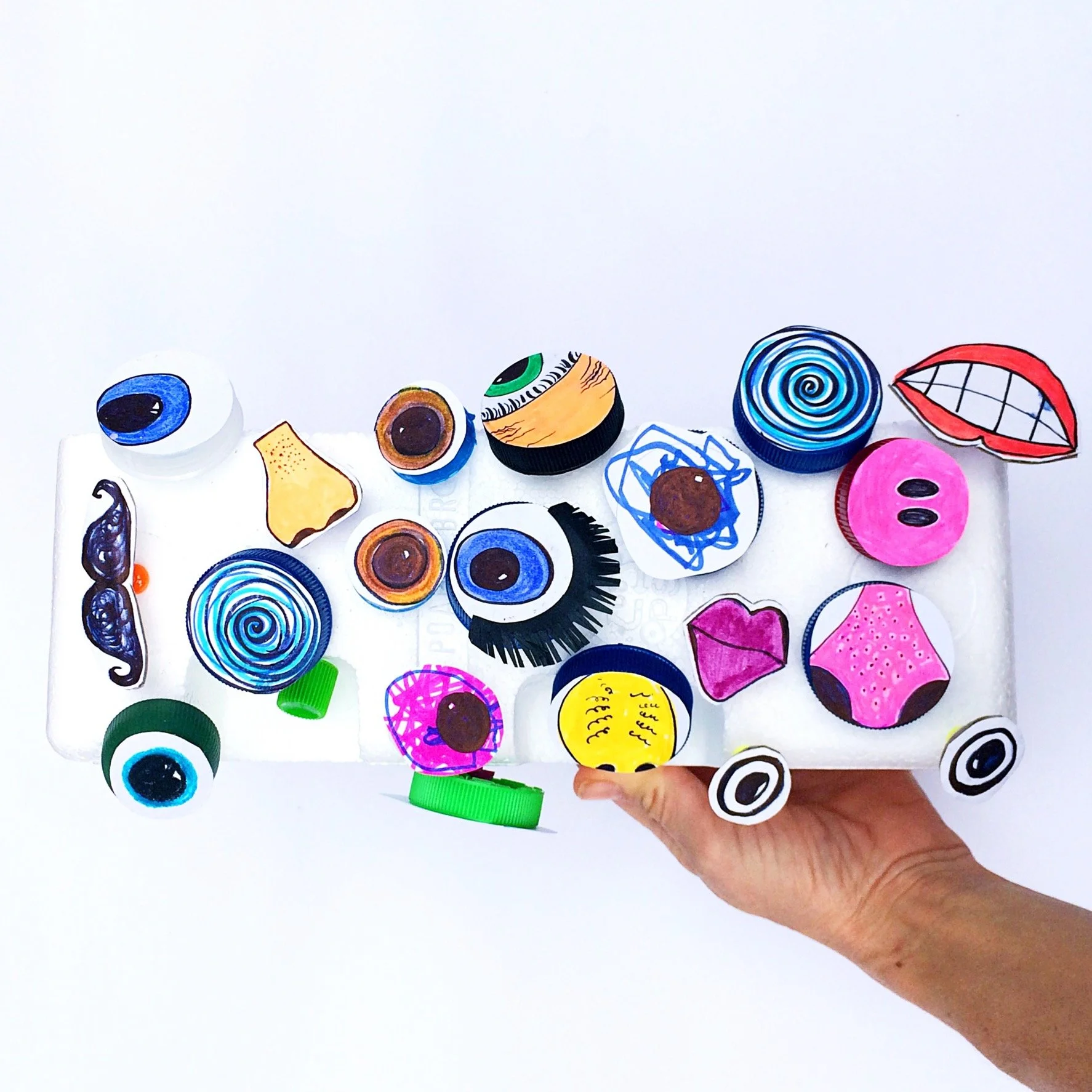 2. Design some cool facial features, colour and cut them out then glue them to the bottle tops.